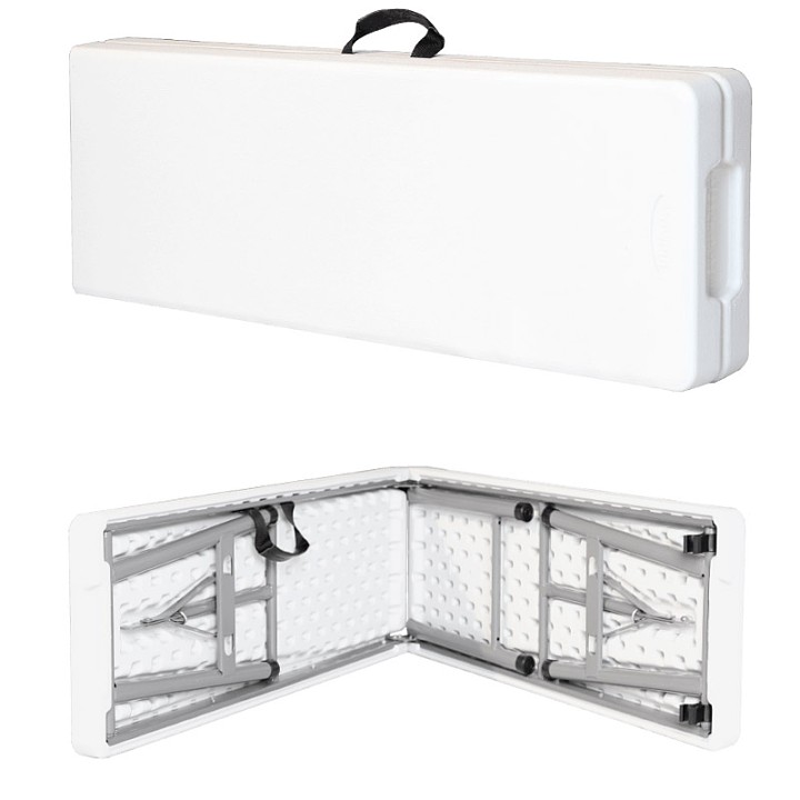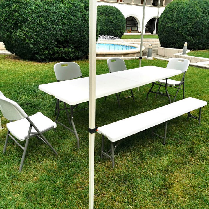Το πλαστικό δεν αλλάζει χρώμα ή αντοχή κάτω από την επίδραση του ήλιου. Το παγκάκι μπορεί να διπλωθεί εύκολα στη μέση και να μεταφερθεί σαν βαλίτσα. Το πλαστικό είναι εύκολο να καθαριστεί χάρη στην αντιολισθητική επεξεργασία. Για 4 άτομα.